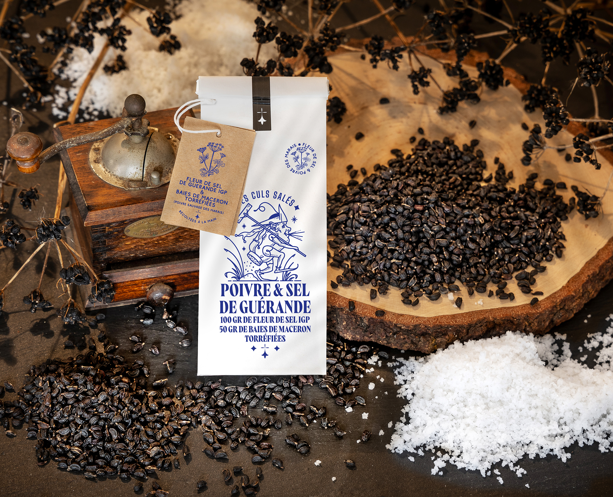 Ingrédients : 100g de fleur de sel de Guérande IGP et 50g de baies de maceron sauvage torréfiées